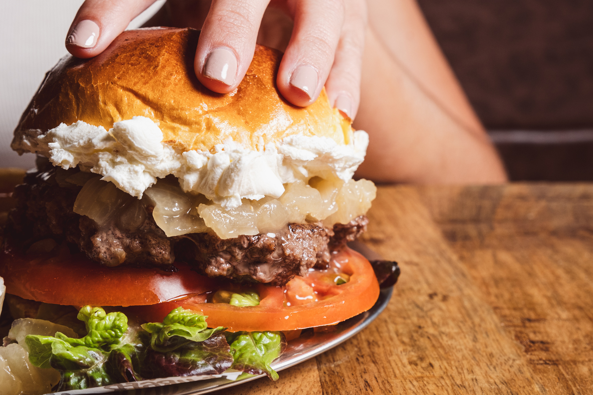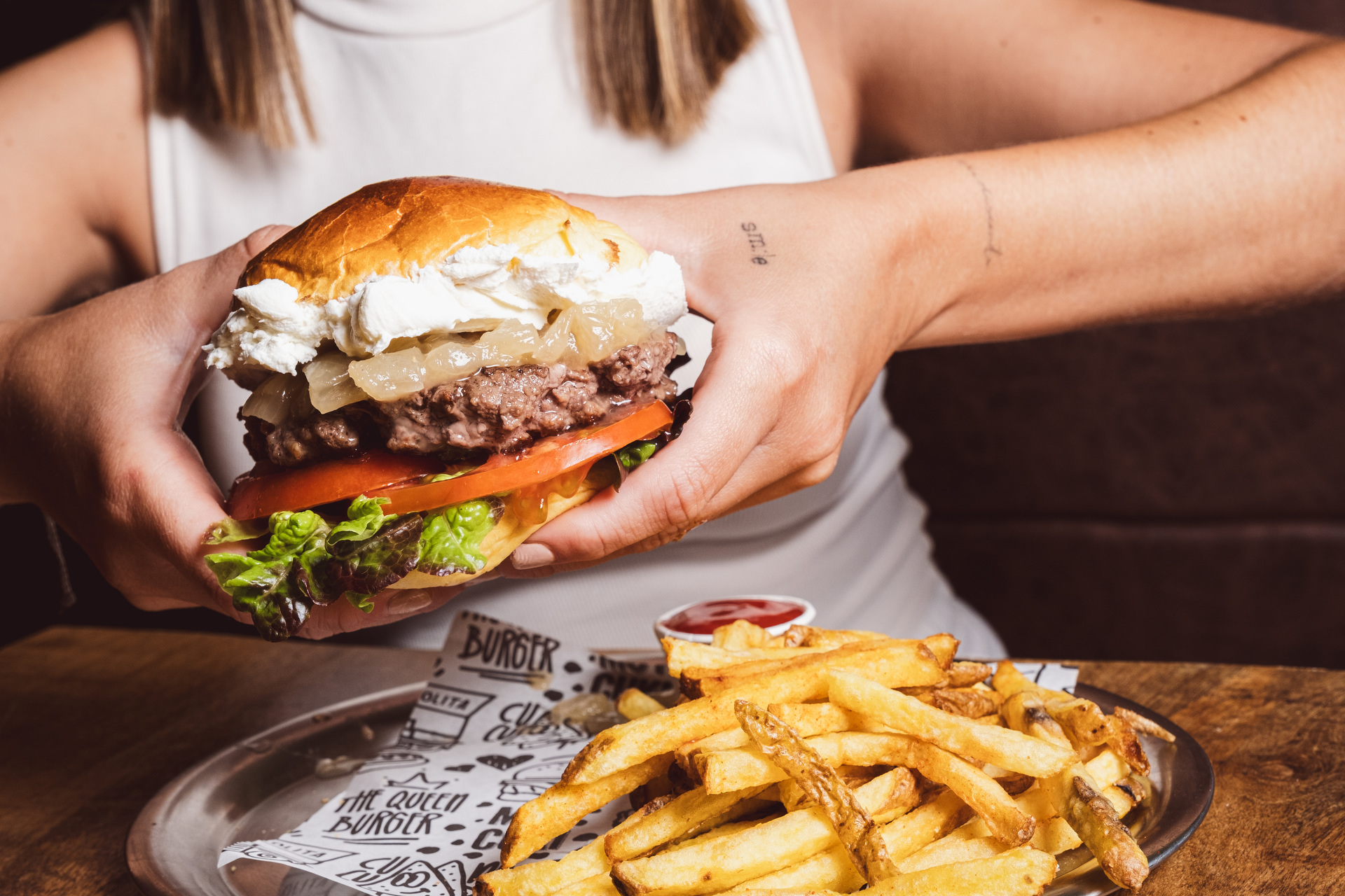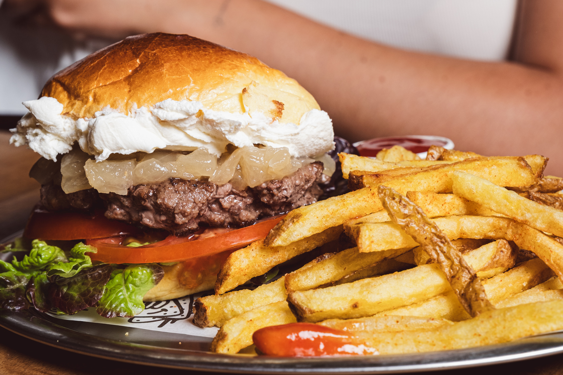 160 gr. de carne de vacuno, queso gouda, cebolla caramelizada y salsa de trufa