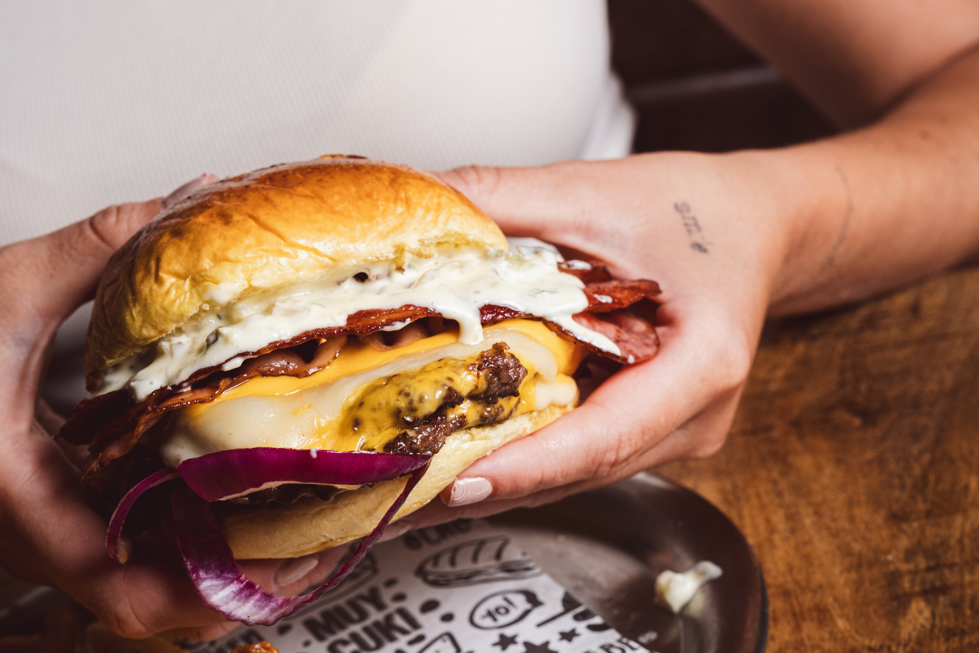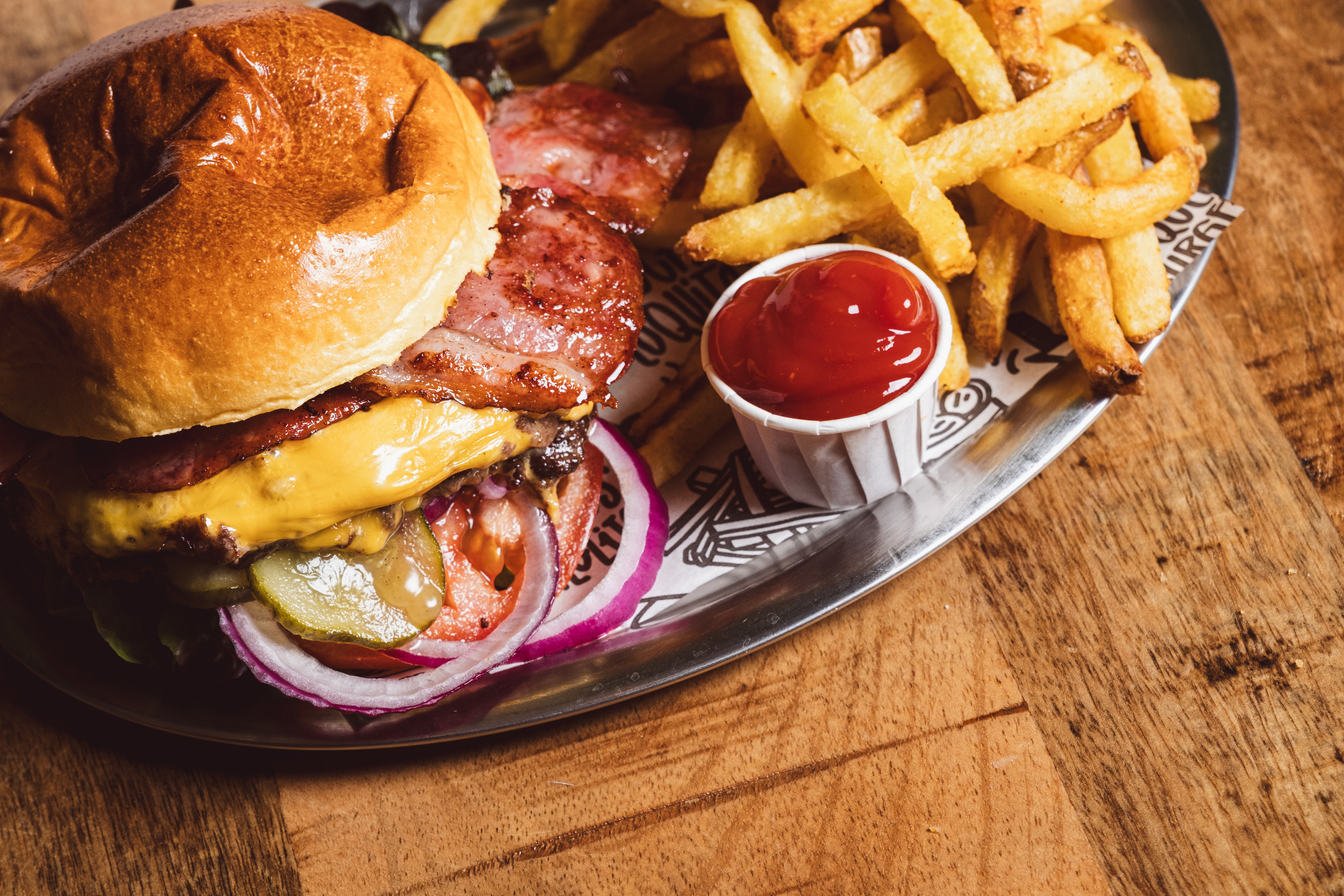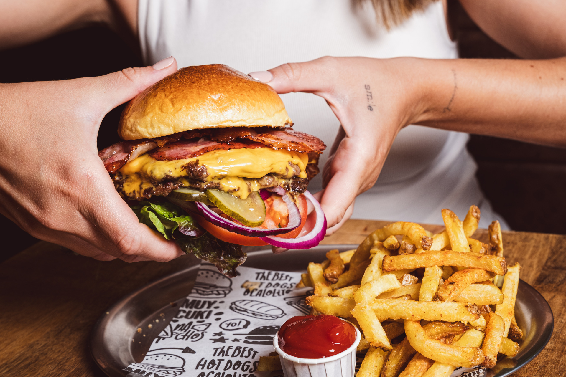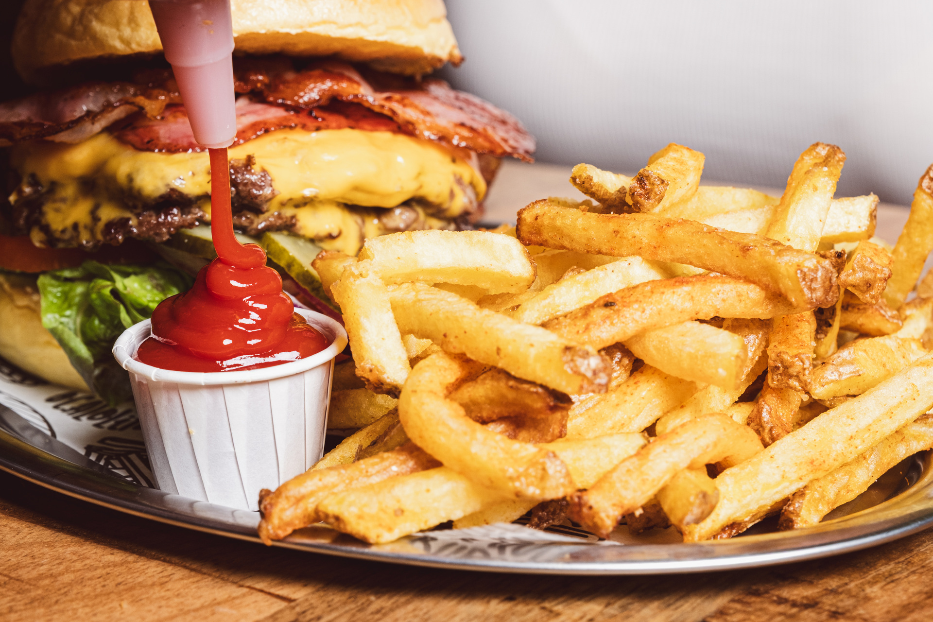 Doble smashburger de carne de vacuno, doble de queso cheddar, kétchup Heinz y mostaza French´s